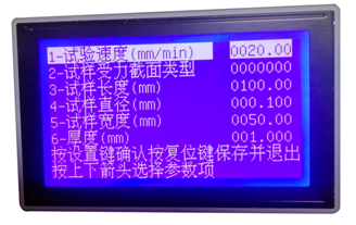 最后兩行是操作提示,其中第一行反白顯示,表示默認(rèn)的是第一行,按[↑]、[↓]鍵可在多個(gè)選項(xiàng)里變換,這些選項(xiàng)都是前一步選擇所需要的參數(shù),前一步的選擇不同,本屏選項(xiàng)的內(nèi)容和數(shù)目也不同。用[↑]、[↓]鍵選中某個(gè)選項(xiàng),則該選項(xiàng)反白顯示,這時(shí)按[設(shè)置]鍵,則該選項(xiàng)內(nèi)容的最后一位閃爍顯示,表示該位可以修改,按[↑]、[↓]鍵則該位在0-9之間變化,按[←]鍵則前移一位閃爍顯示,該項(xiàng)的內(nèi)容修改完畢后按[設(shè)置]鍵,則數(shù)字停止閃爍,整個(gè)參數(shù)項(xiàng)繼續(xù)反白顯示,這時(shí)按[↑]、[↓]可以選擇其他參數(shù)項(xiàng)。當(dāng)所有的參數(shù)修改完畢后按[復(fù)位]鍵,則保存剛才所有的修改并進(jìn)入到正常試驗(yàn)狀態(tài)。